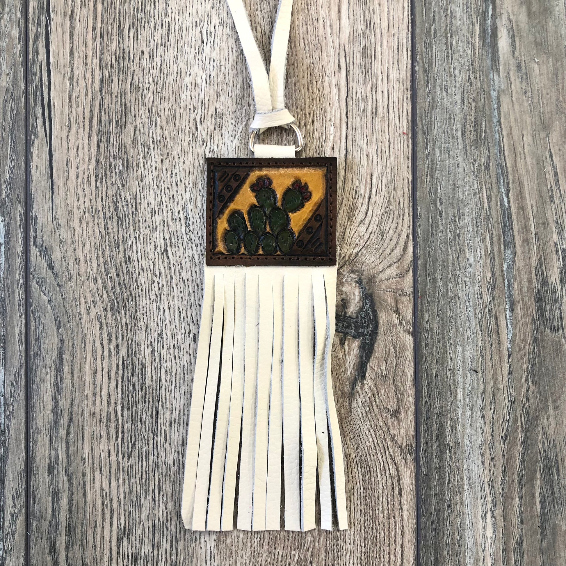 Complete your look with this handmade prickly pear necklace. This is a necklace that can be wore casual or dressy. Hand tooled and hand painted, these necklaces are a work of art! Adjustable leather ties to create the perfect length for you. No returns on sale items.