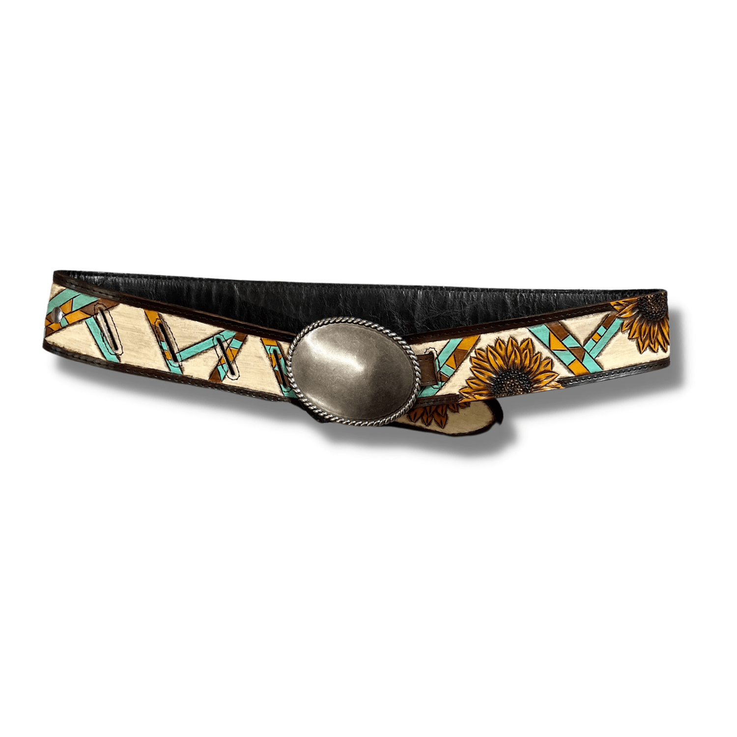 This gorgeous Sunflower belt is a narrow, tooled statement piece. Pair with jeans or with a dress; this beauty also can be used as a strap on any of our handbags. It may fit through your belt loops, but it is designed to be worn more as a fashion piece.
