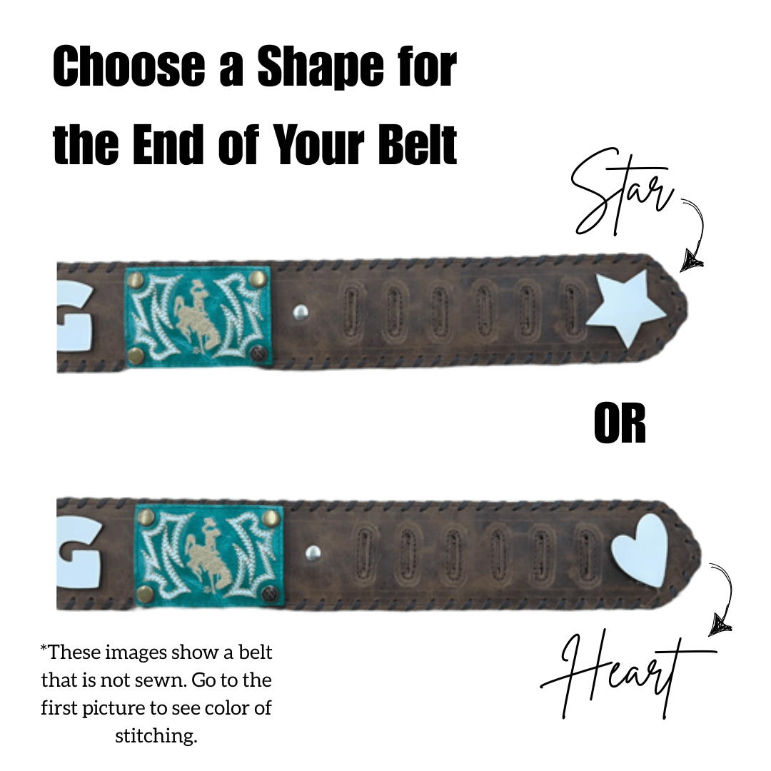 That's it! Just four easy steps! All stitching will be contrasting stitching using Dixies best judgement. If your word is short and arrows needed to be added to fill the space, they will be the same leather color as the lacing on the belt. Just a reminder belt buckles and patches are sold separately!