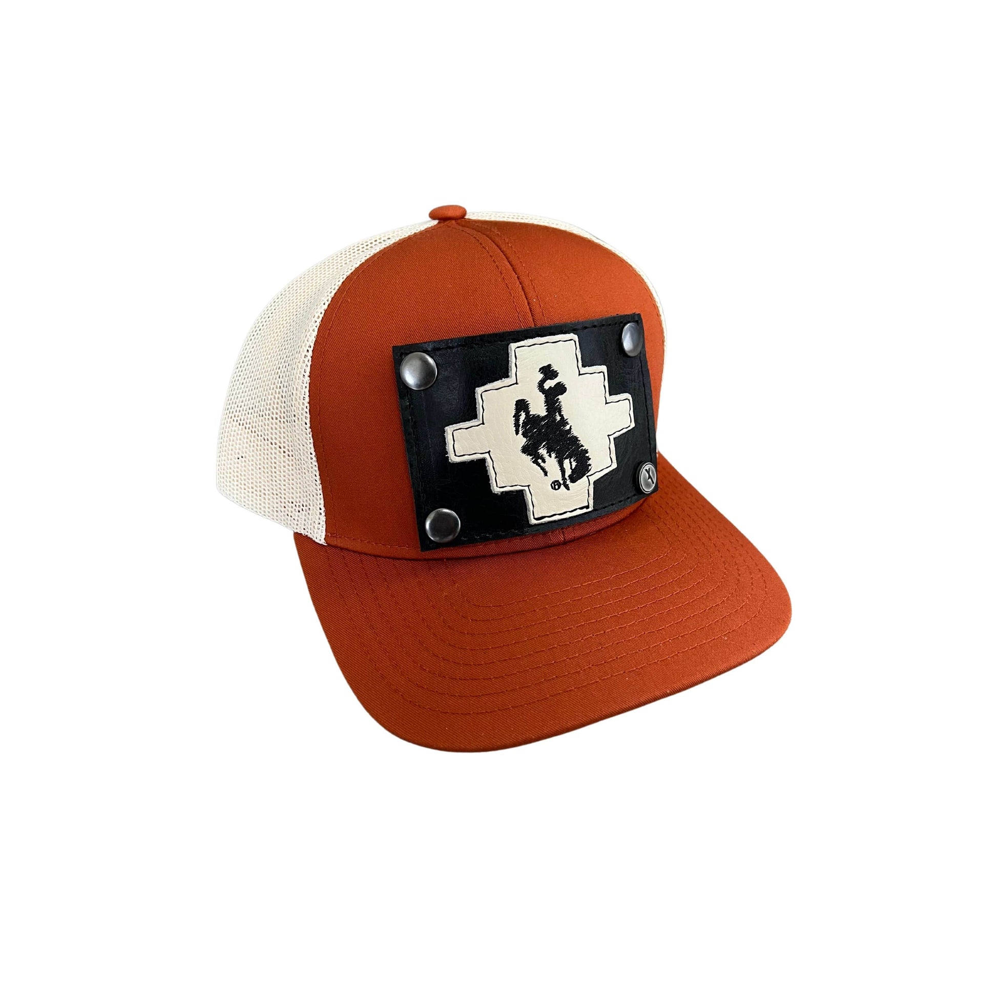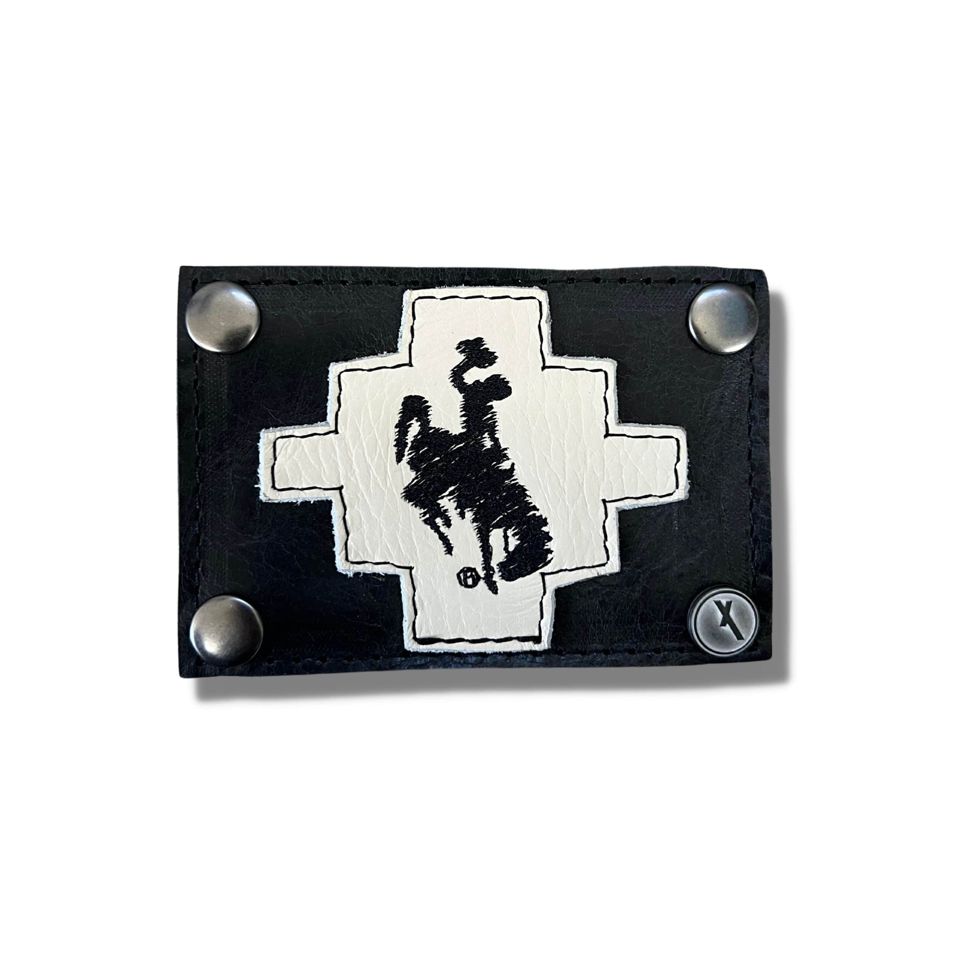 A geometric pattern with a rodeo flare! Now you can add it as the feature to your hat or snap in onto the front of a mini for that unique look. This patch has an ivory leather geometric appliqué on black leather with a bucking bronco embroidered design.