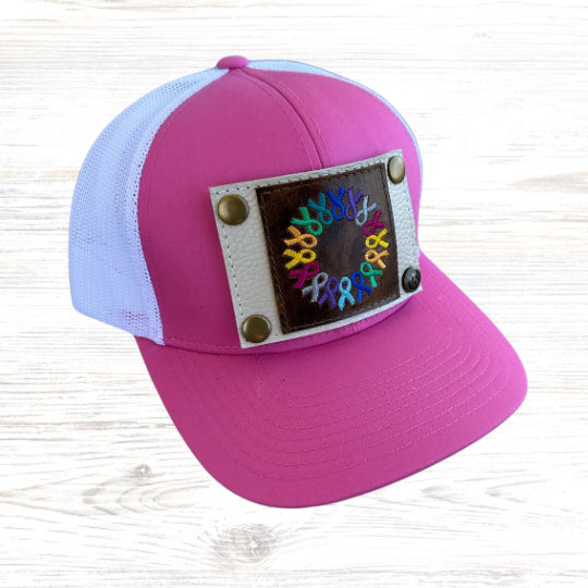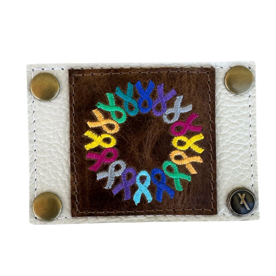 Show your support with our Cancer Awareness Patch, designed to honor survivors and loved ones affected by cancer. Featuring a vibrant circle of multicolored ribbons, this patch is a bold symbol of strength and unity. Crafted with premium leather and durable snaps, it's perfect for adding to hats, bags, or jackets. Wear it proudly and stand with the cancer-fighting community!