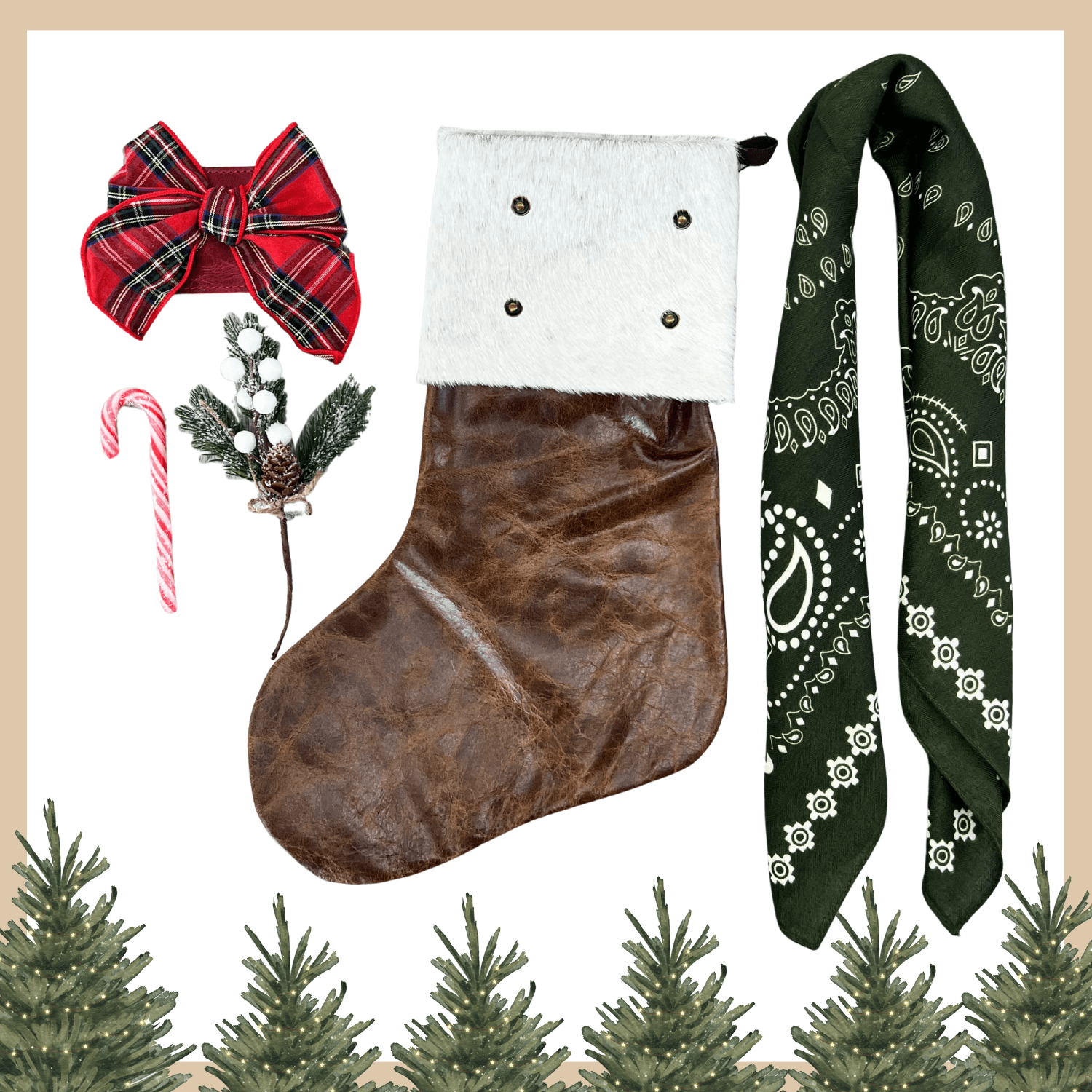 Elevate your holiday mantel with these stunning handmade leather stockings featuring luxurious hair-on-hide linings—a timeless piece that brings rustic charm to any home. Pair them with our coordinating red flannel bow for an authentic, festive look.