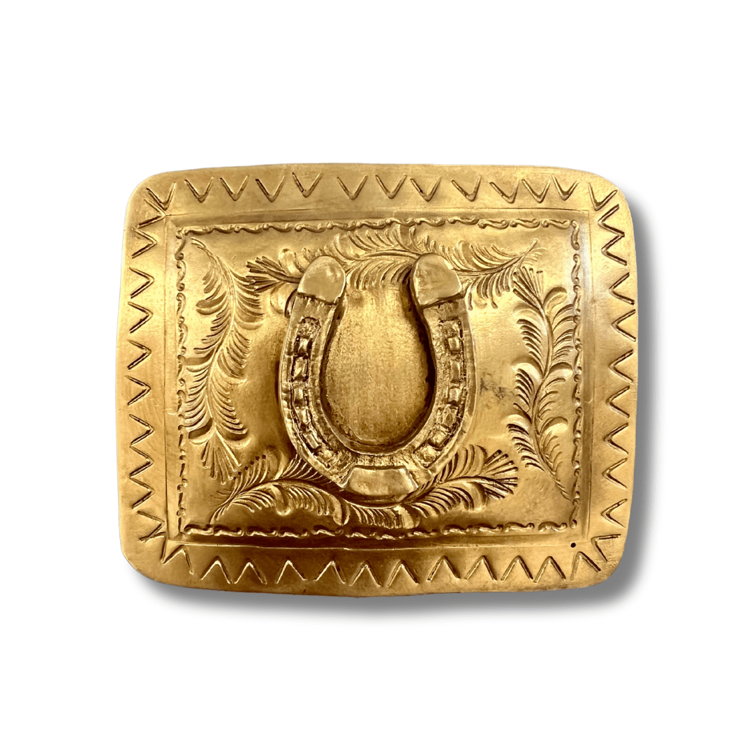 This beautiful gold horseshoe buckle can spruce up any belt! All are handmade!