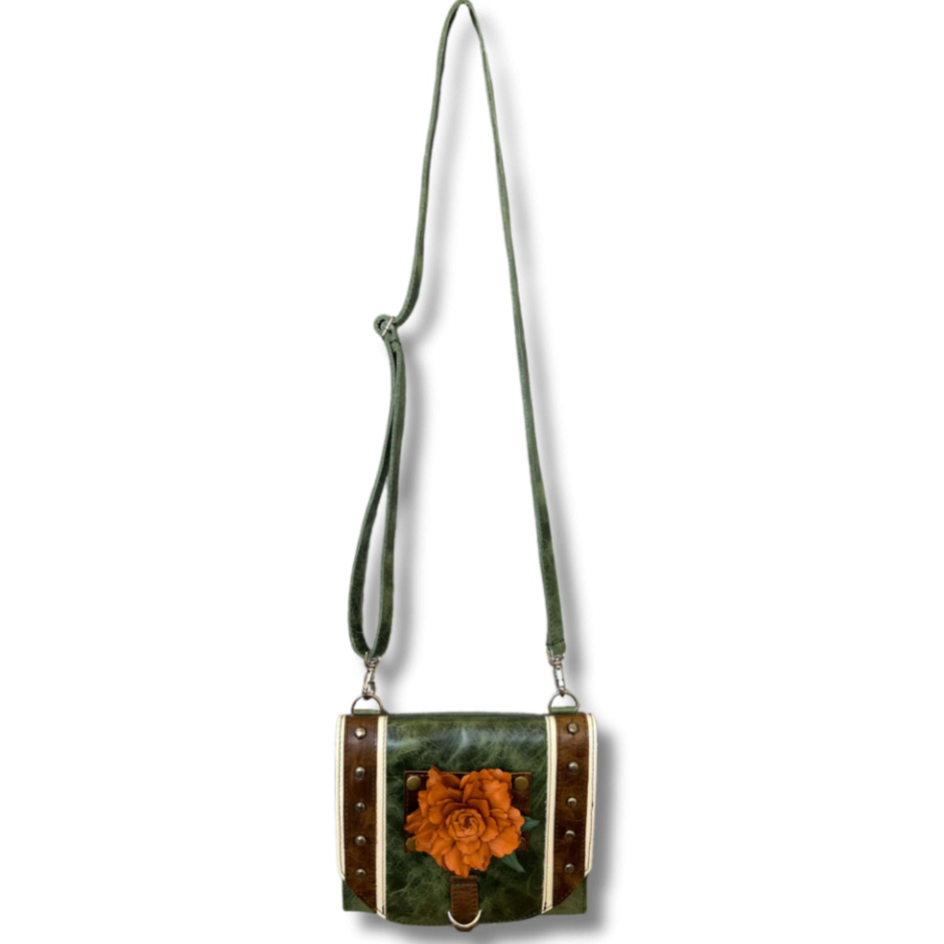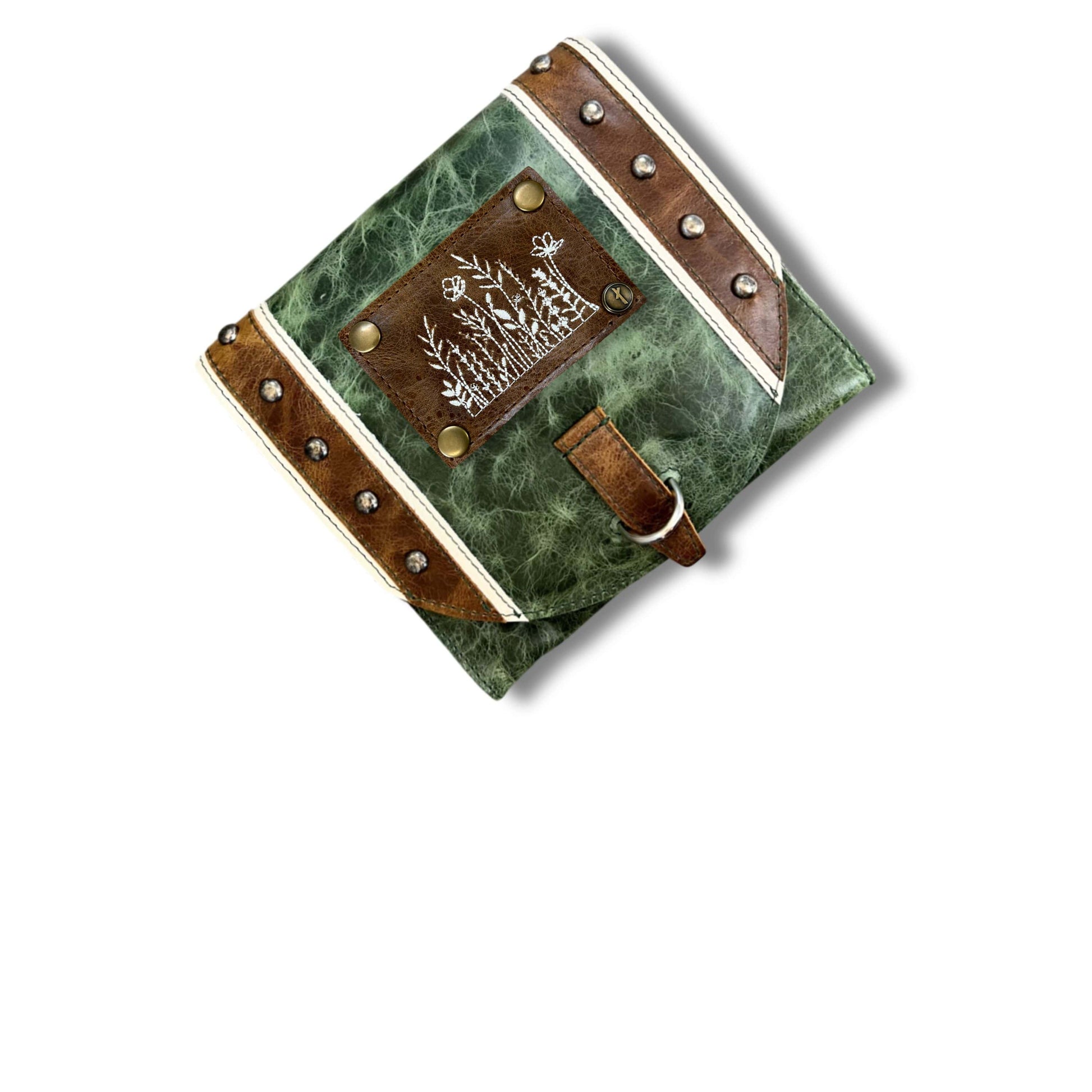 Made to hold just a little bit more that our other minis, but still has the same functionality. This new pouch design also includes a built in wallet. You cannot go wrong with this unique olive green pouch with tan leather accents.
