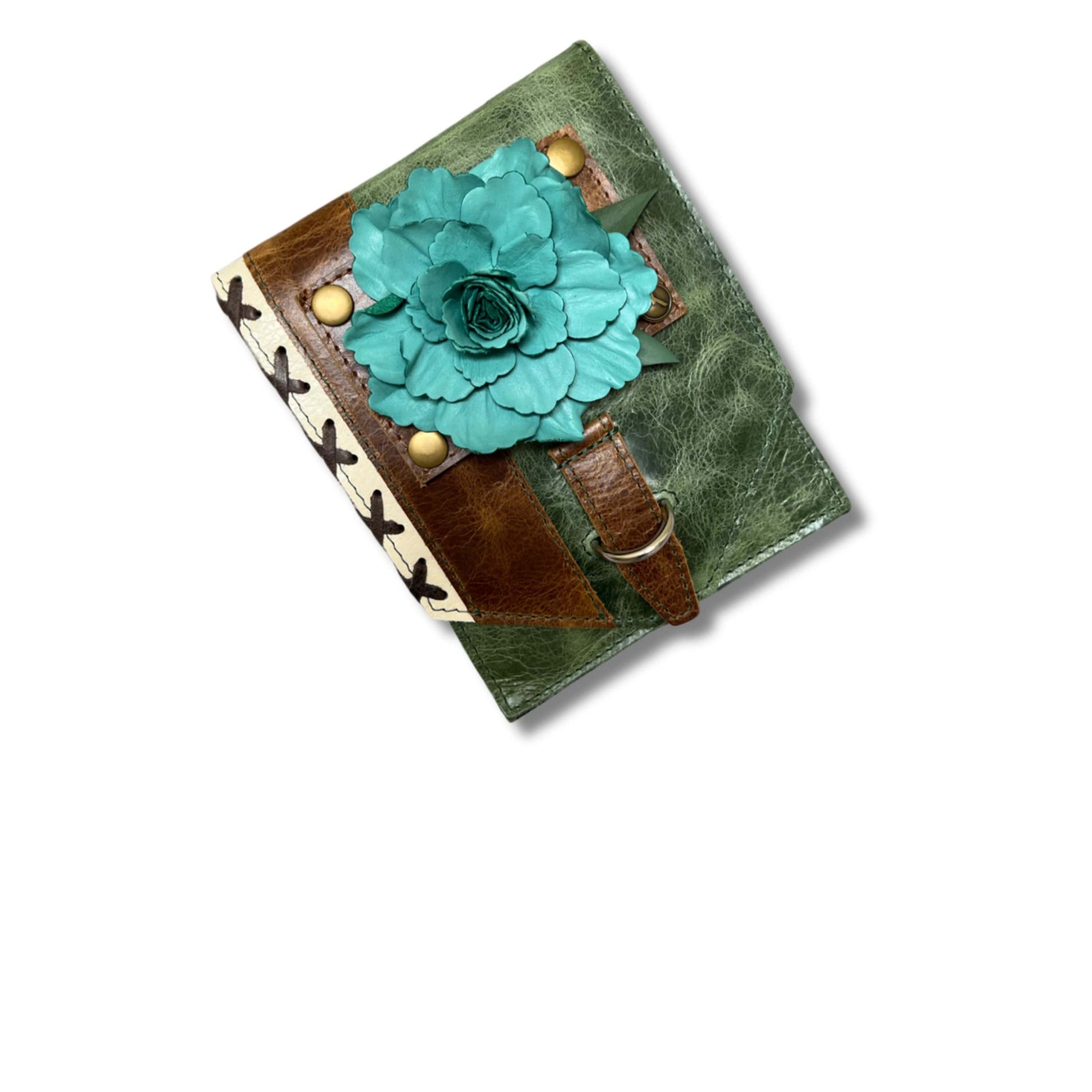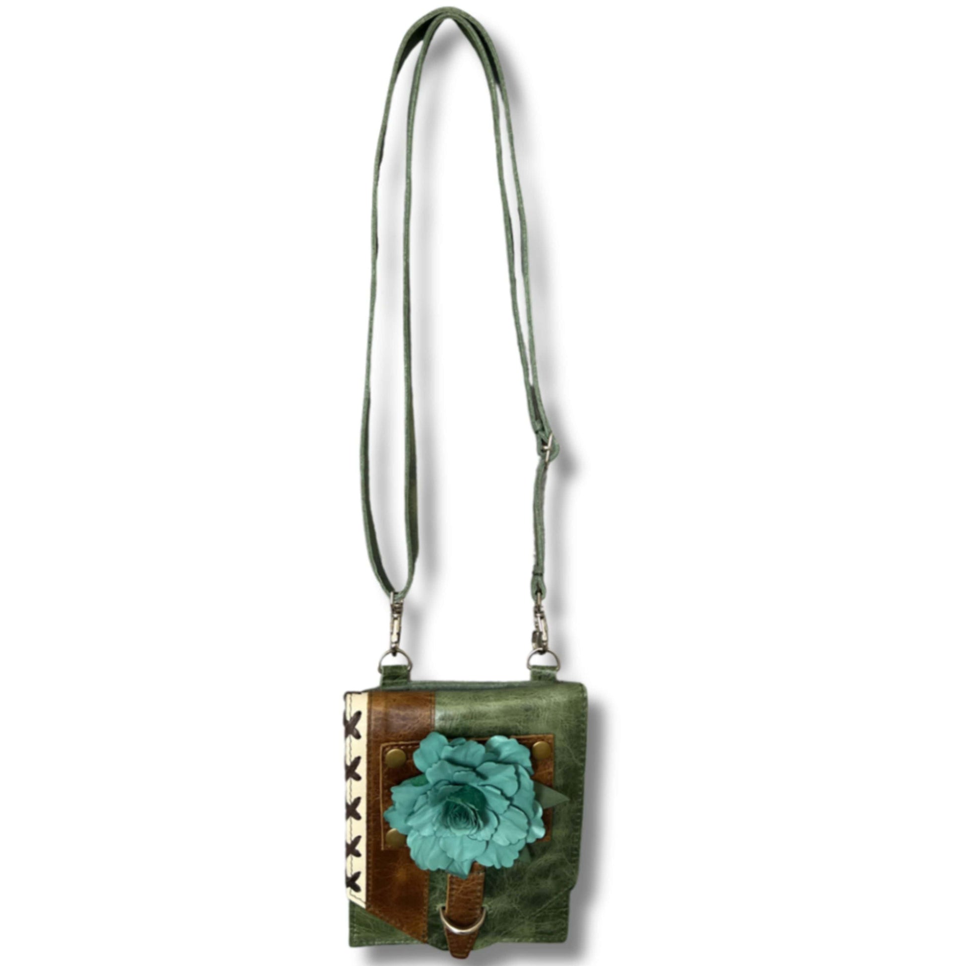 Apart of the Judy Lou Collection, the Huntley mini has beautiful tan and ivory accents on olive green leather.