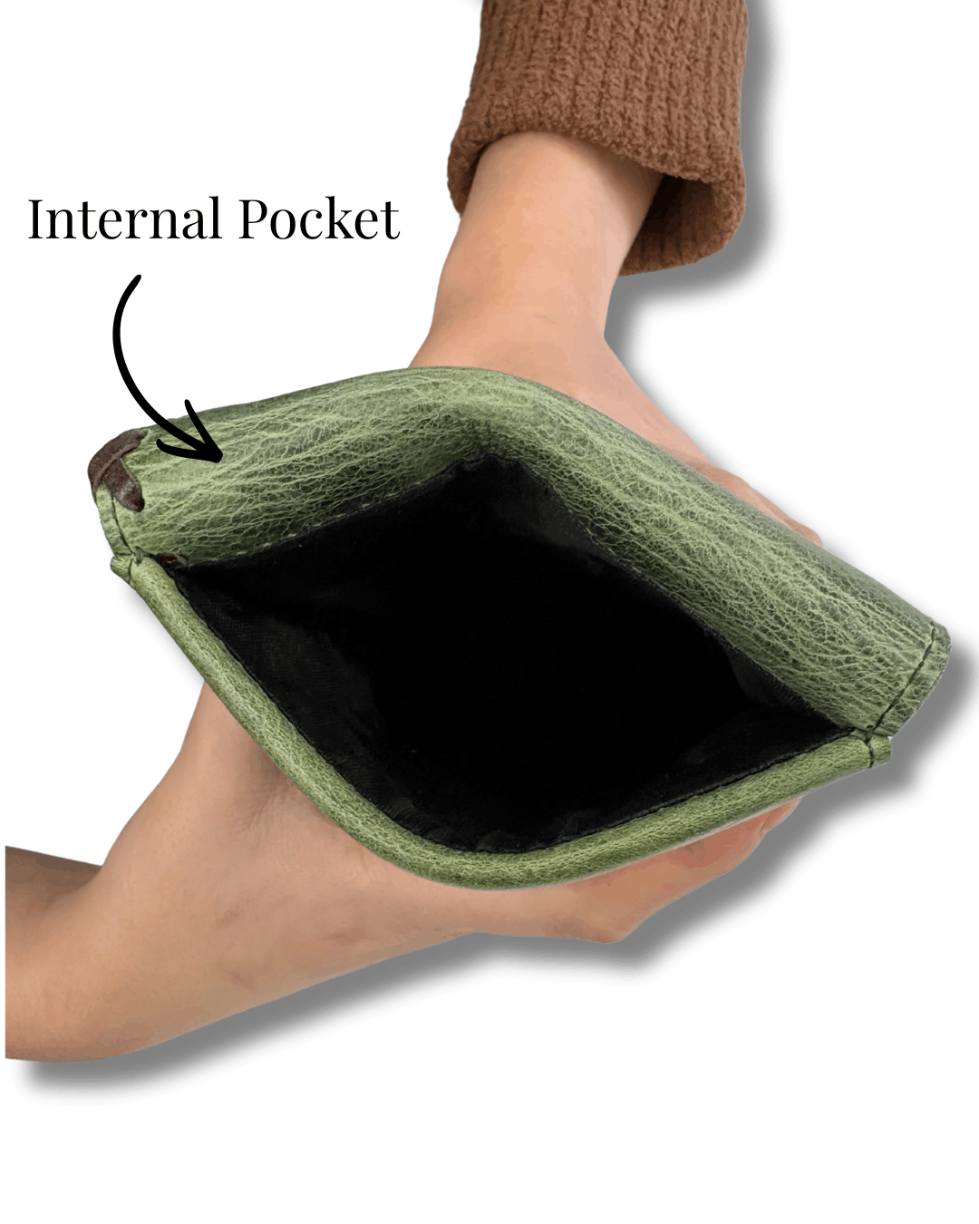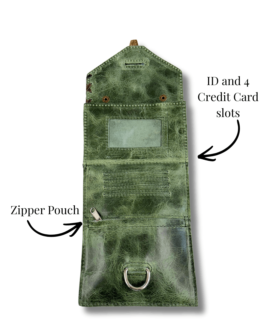 Interior has places for ID, cards, cash, zipper pocket, and deep full length pocket.