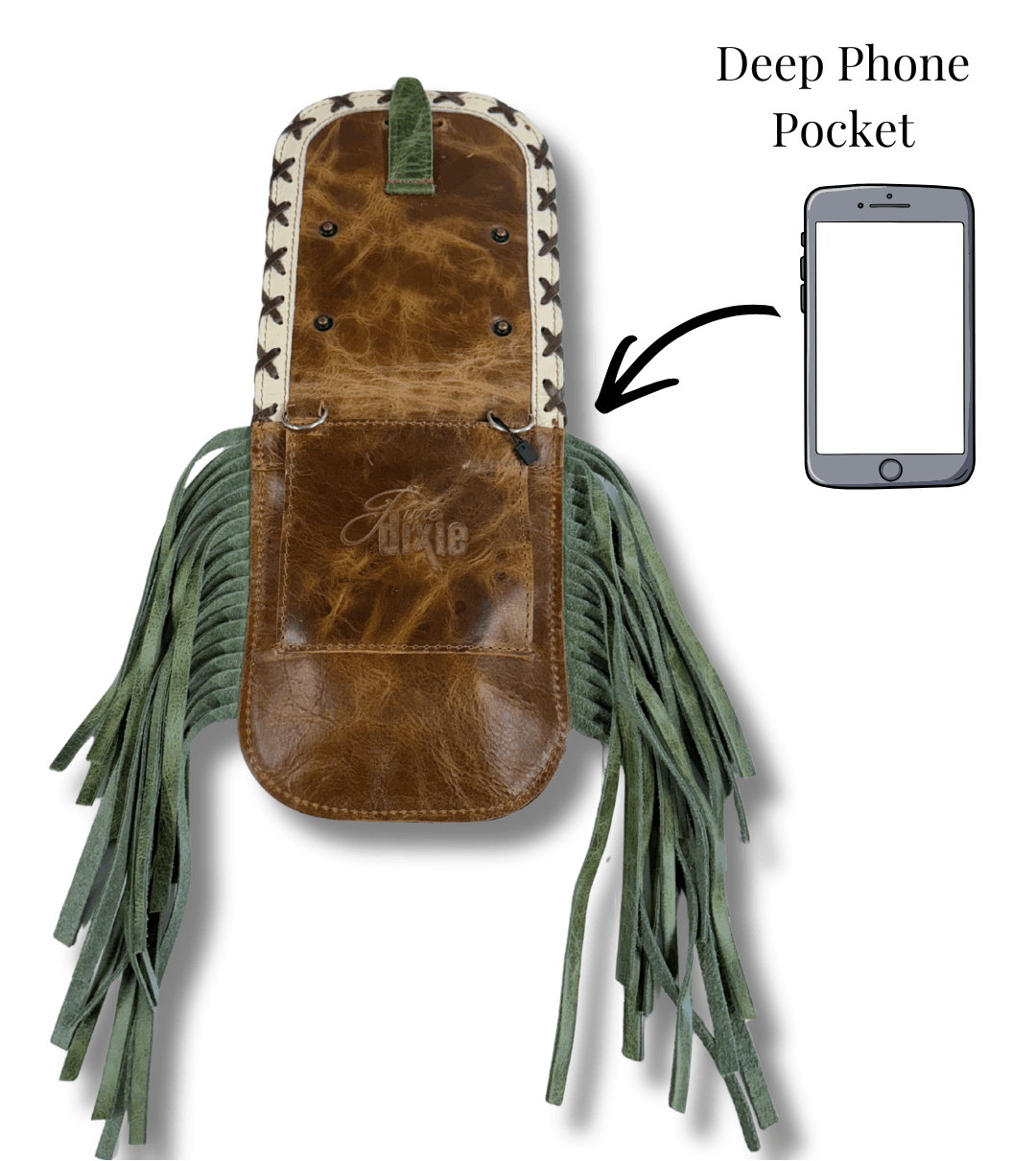 Apart of the Judy Lou Collection, the JD Mini gives a new look with the rounded corners and beautiful tan and olive green leather.