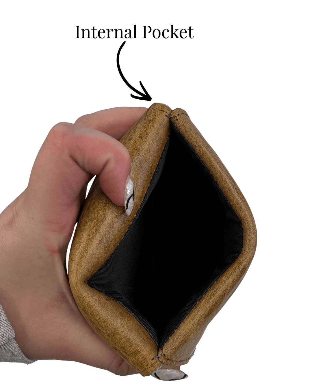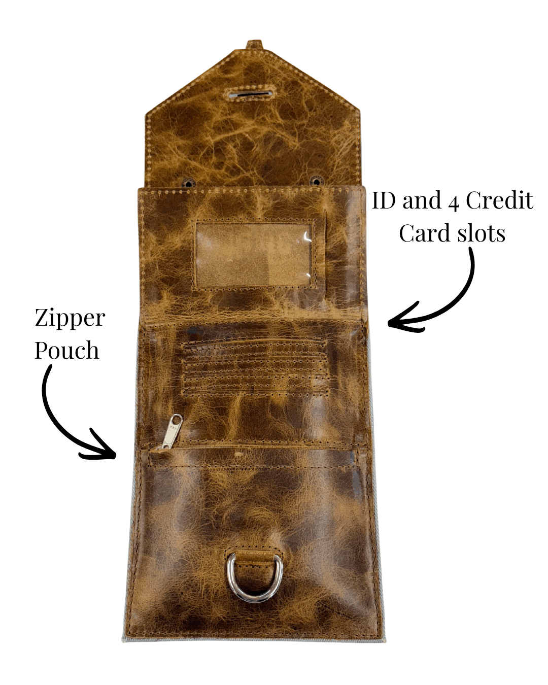 - Interior has place for ID, cards, cash, zipper pocket, and deep full length pocket