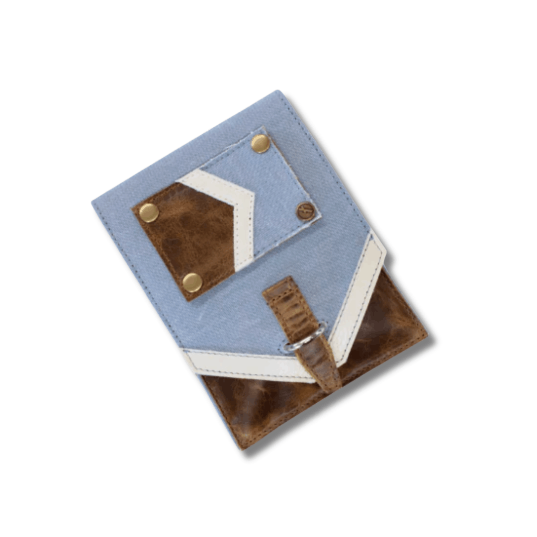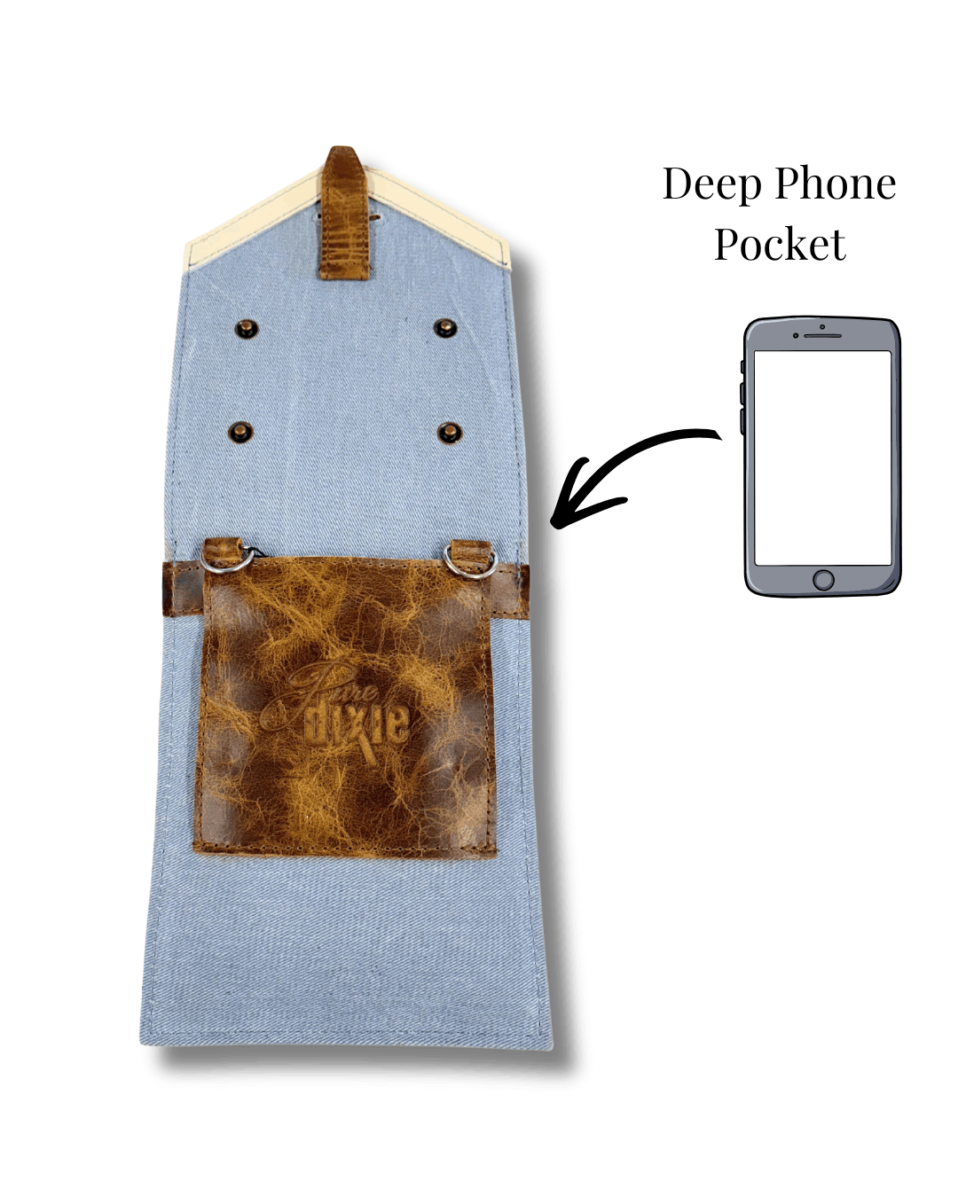 The unique design provides the perfect color combo that will go with everything! Made with denim fabric, tan and ivory leather accents. Wear it as a crossbody or attached to any one of our bigger handbags!