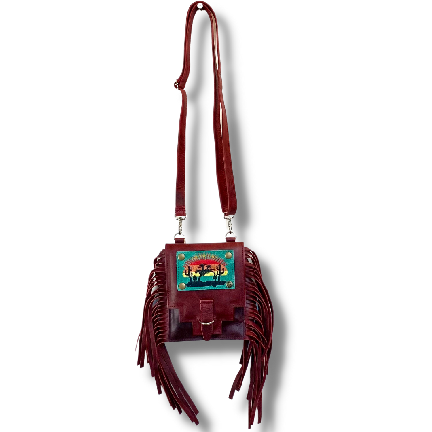 Simple in design with southwest cut front flap. The fringe makes this one fun and completely practical for all occasions. Bold red helps you standout from the crowd!