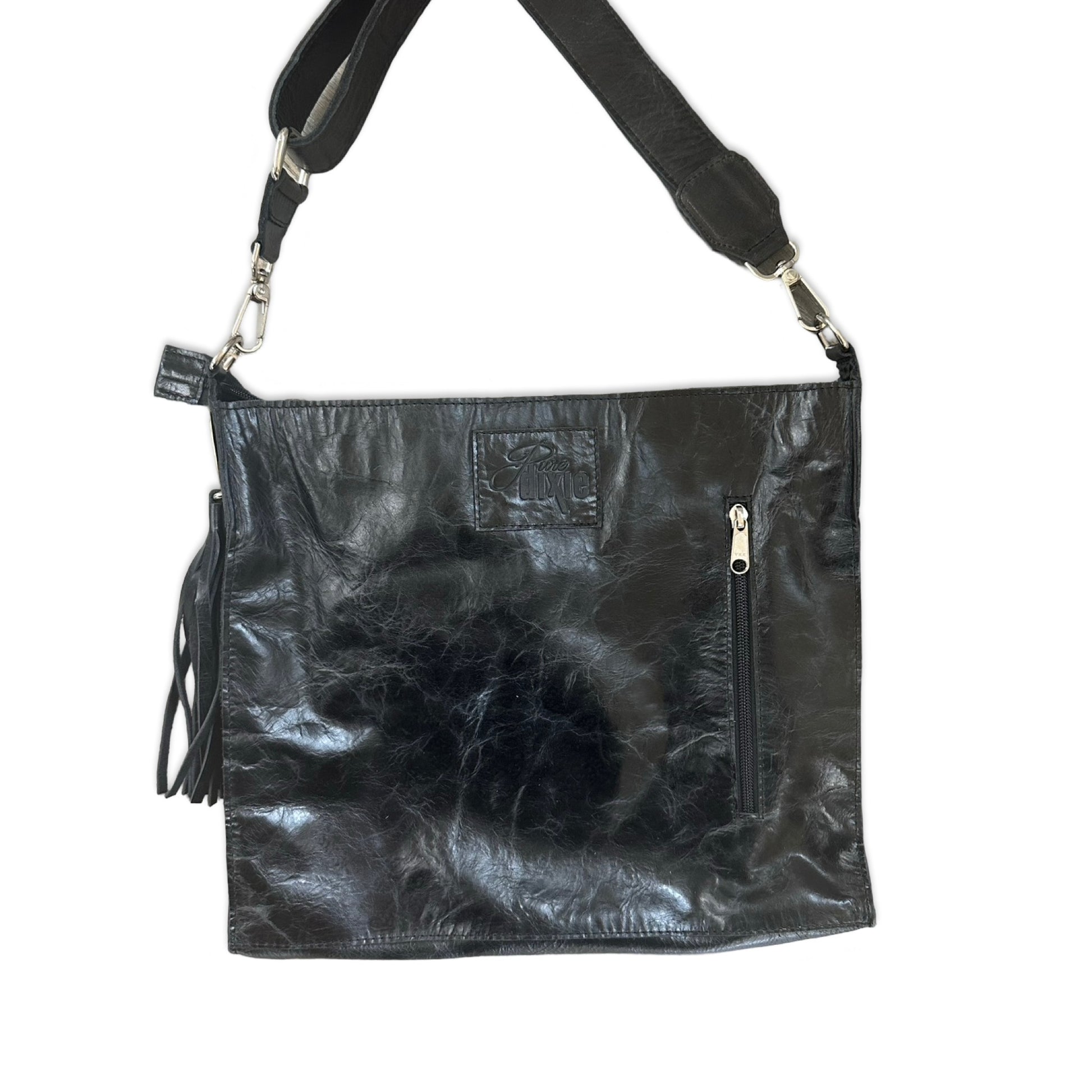 This is our most popular sized bag. Big enough to pack a lot of stuff, but very comfortable to carry. Now featuring a zip closure at the top and a concealed carry compartment on the back! Holds folders, iPads, notebooks perfectly!