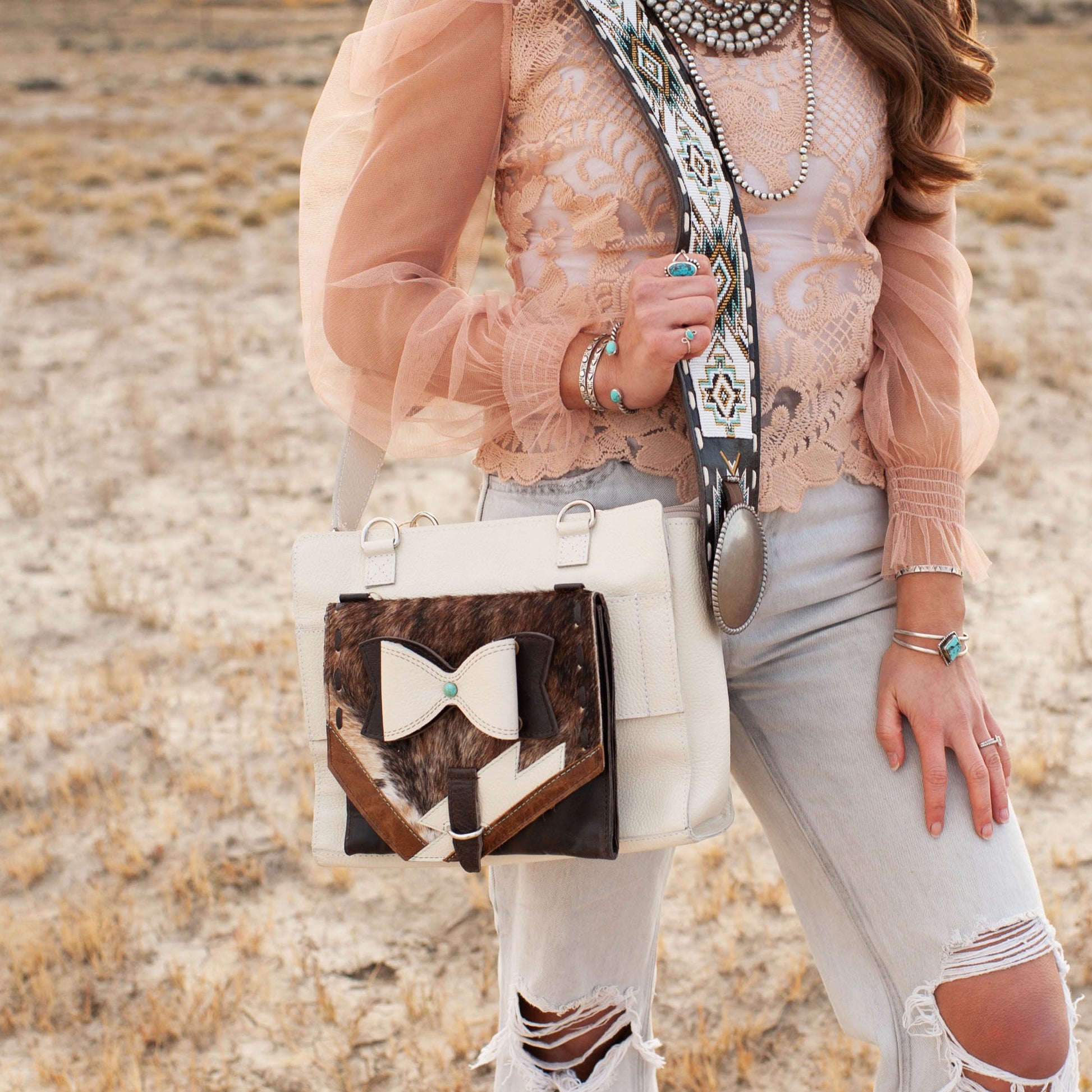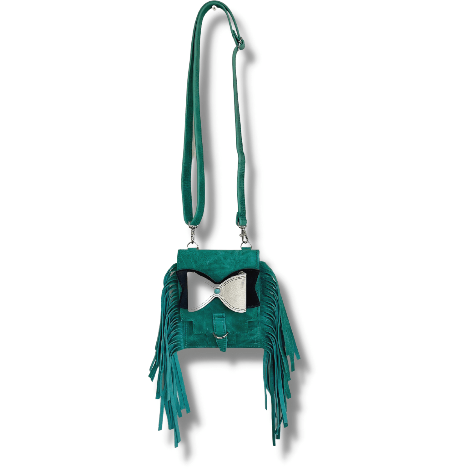Stand out with this stunning bow patch that can also be a necklace! It's a perfect accent to stand out and be unique! Classic shape and design will make this a piece that stands the test of time! Beautiful brown and ivory leather accented with a delicate turquoise stone.