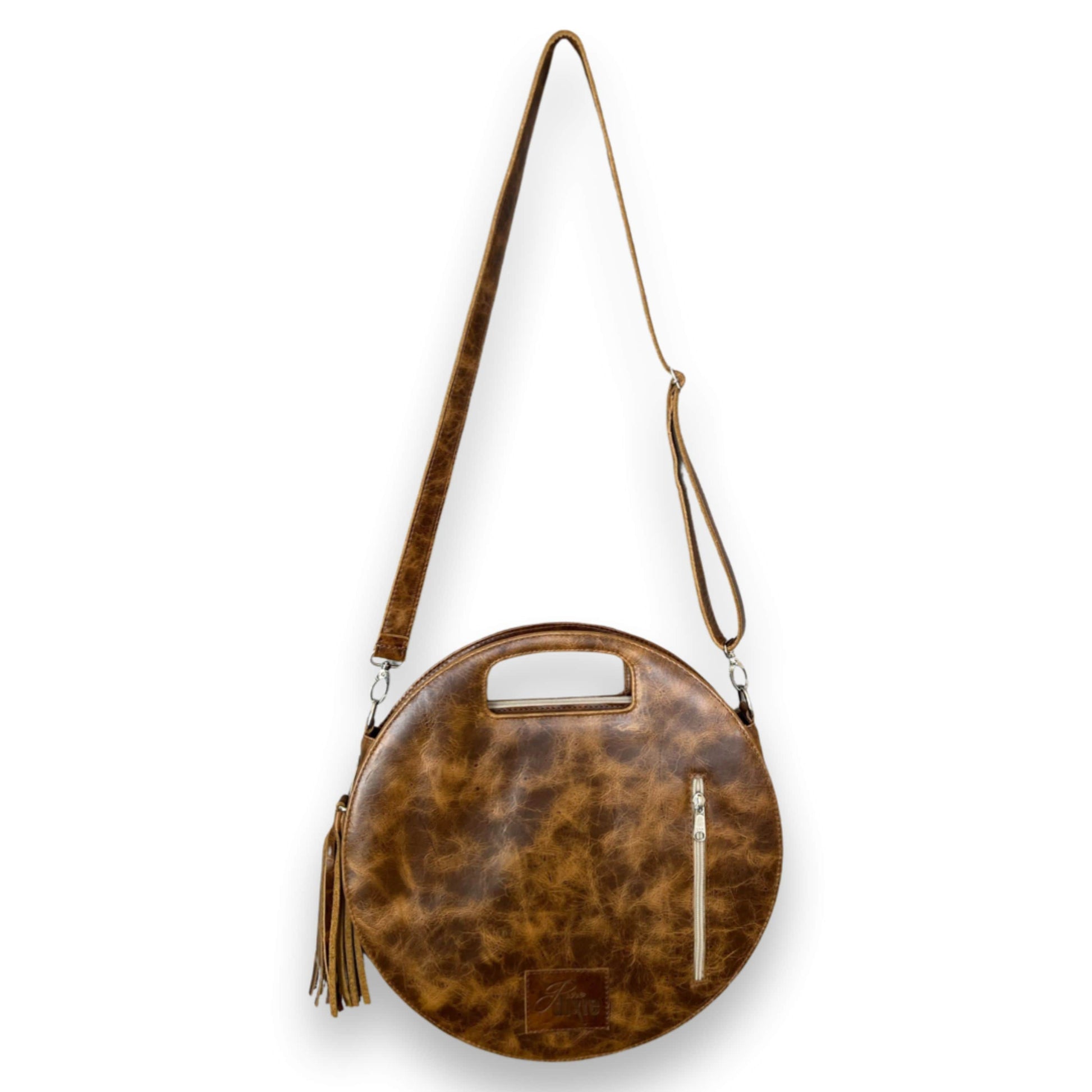 The Judy handbag is apart of the Judy Lou collection and is a new shape and design. The unique circle shape with the classic tan leather is the perfect addition to your closet!\