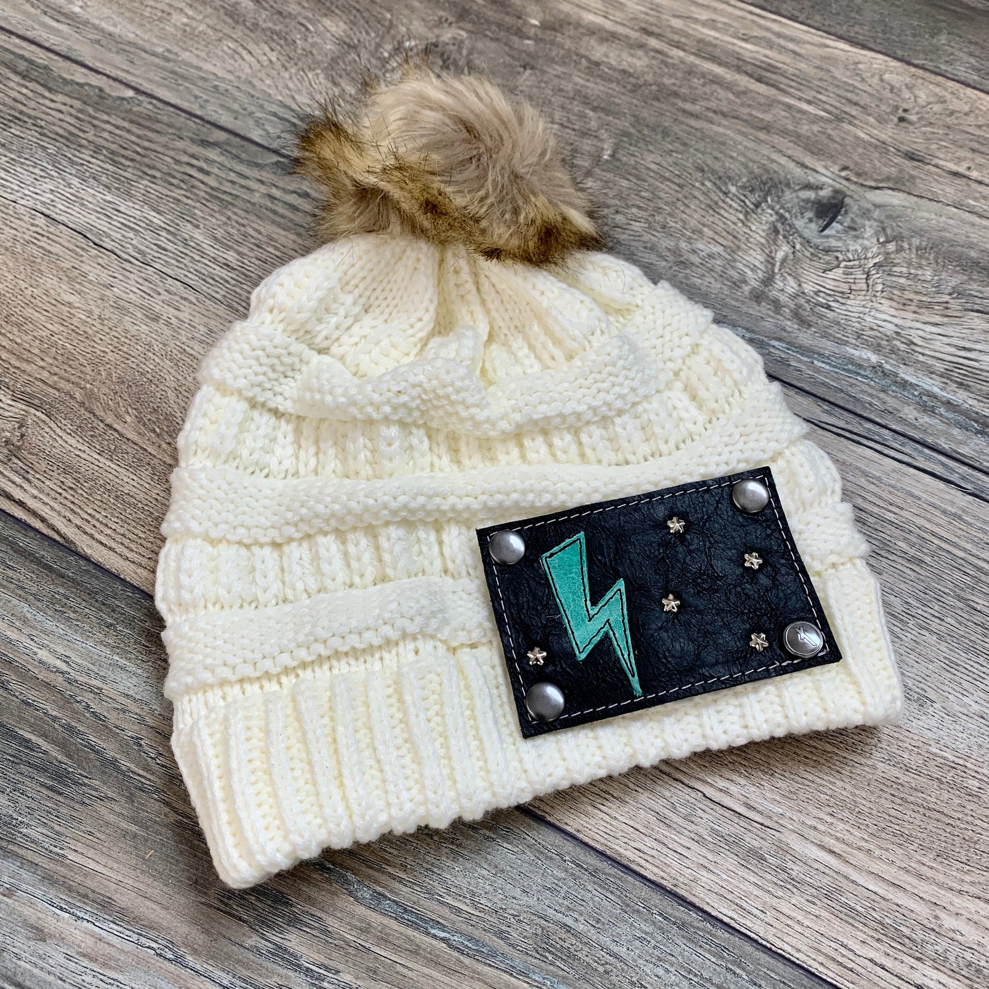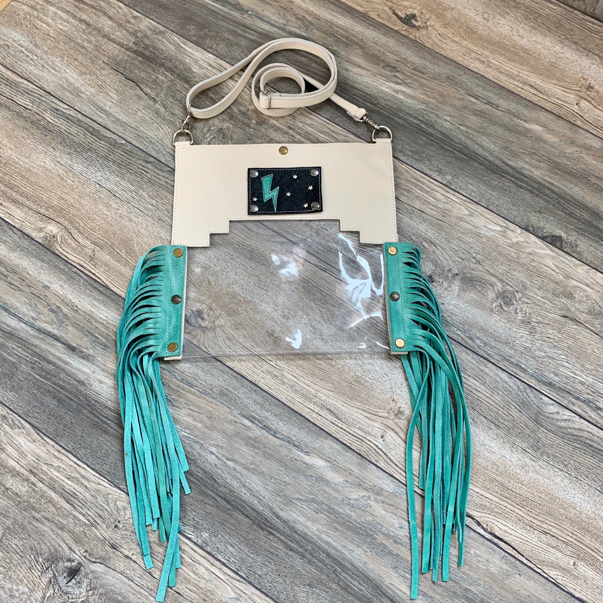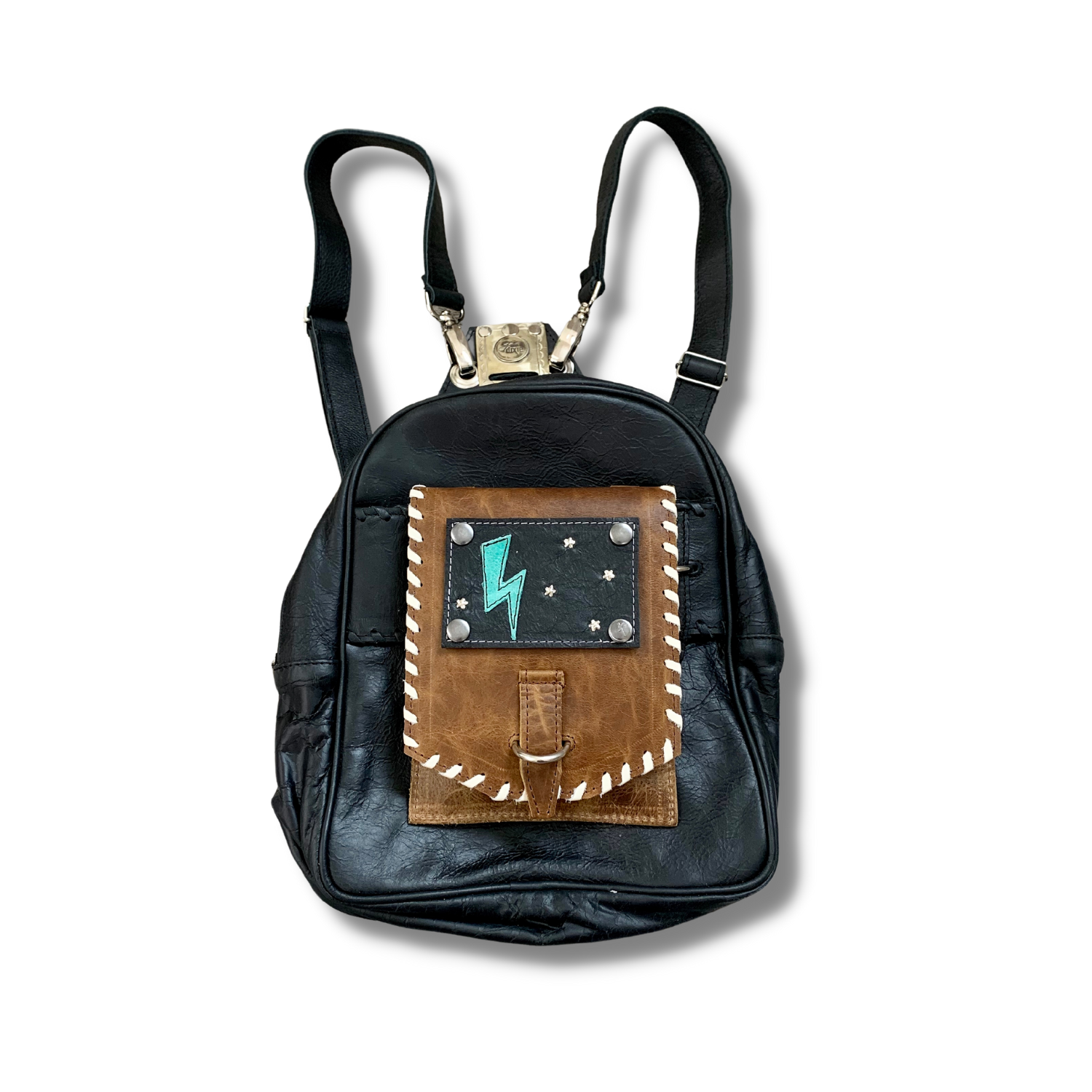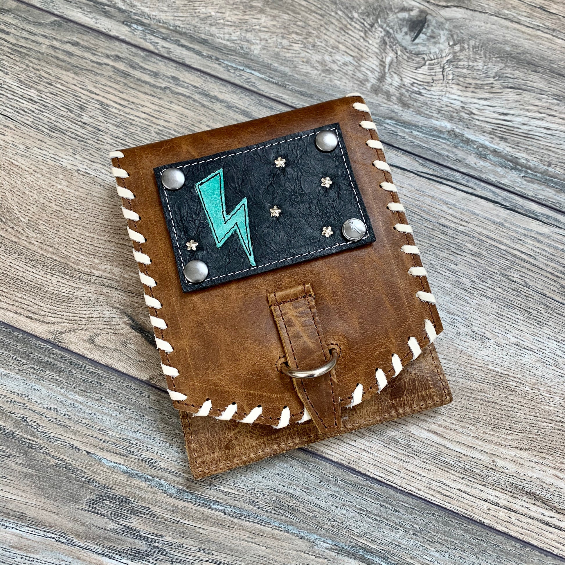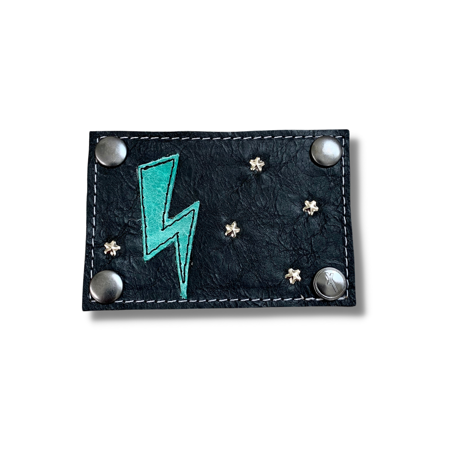With an iconic lightning bolt appliqué in fun minty turquoise, The Lightning Patch is perfect for rock n' roll girls and cowgirls alike! White embroidery stars and white contrast stitching stand out on sleek black leather.