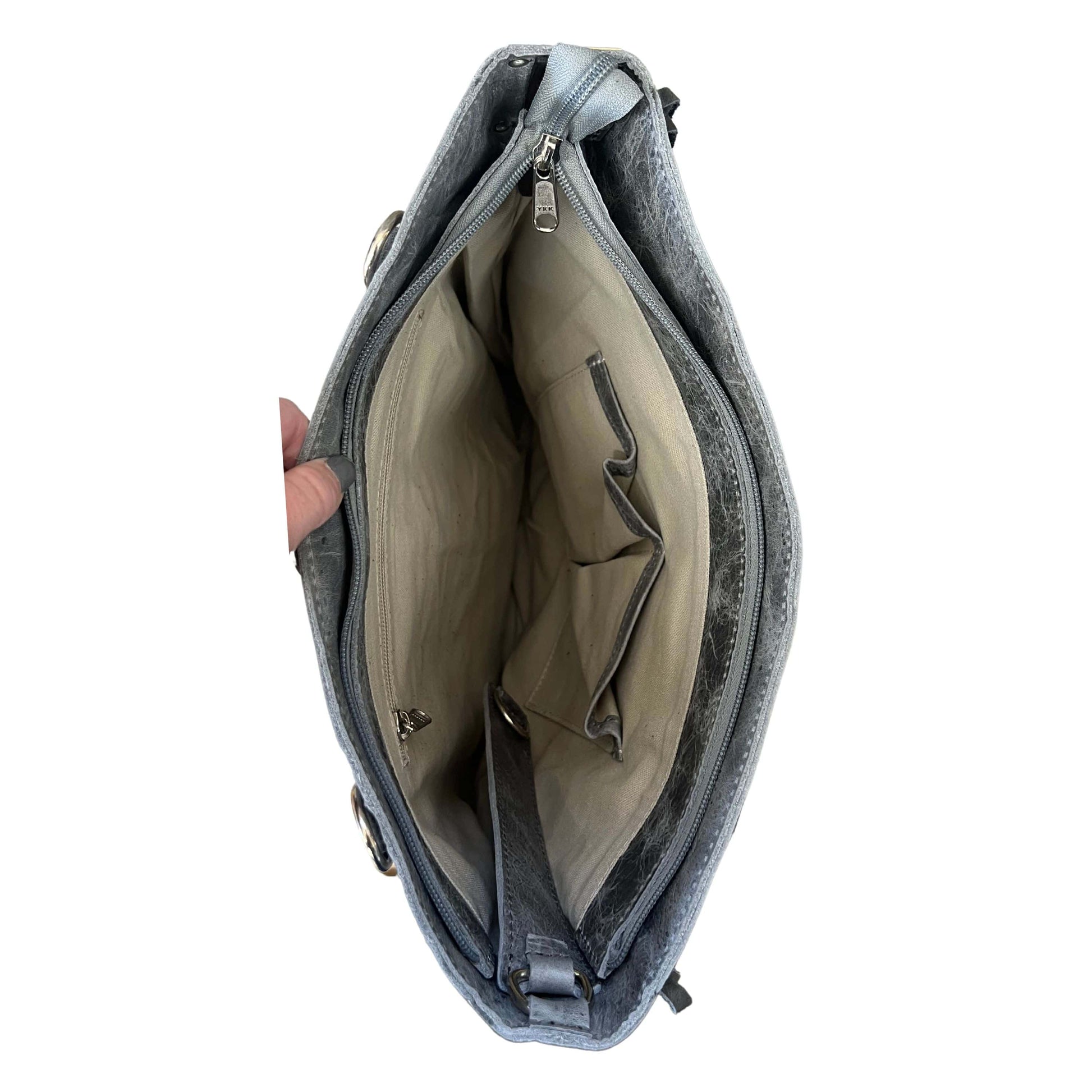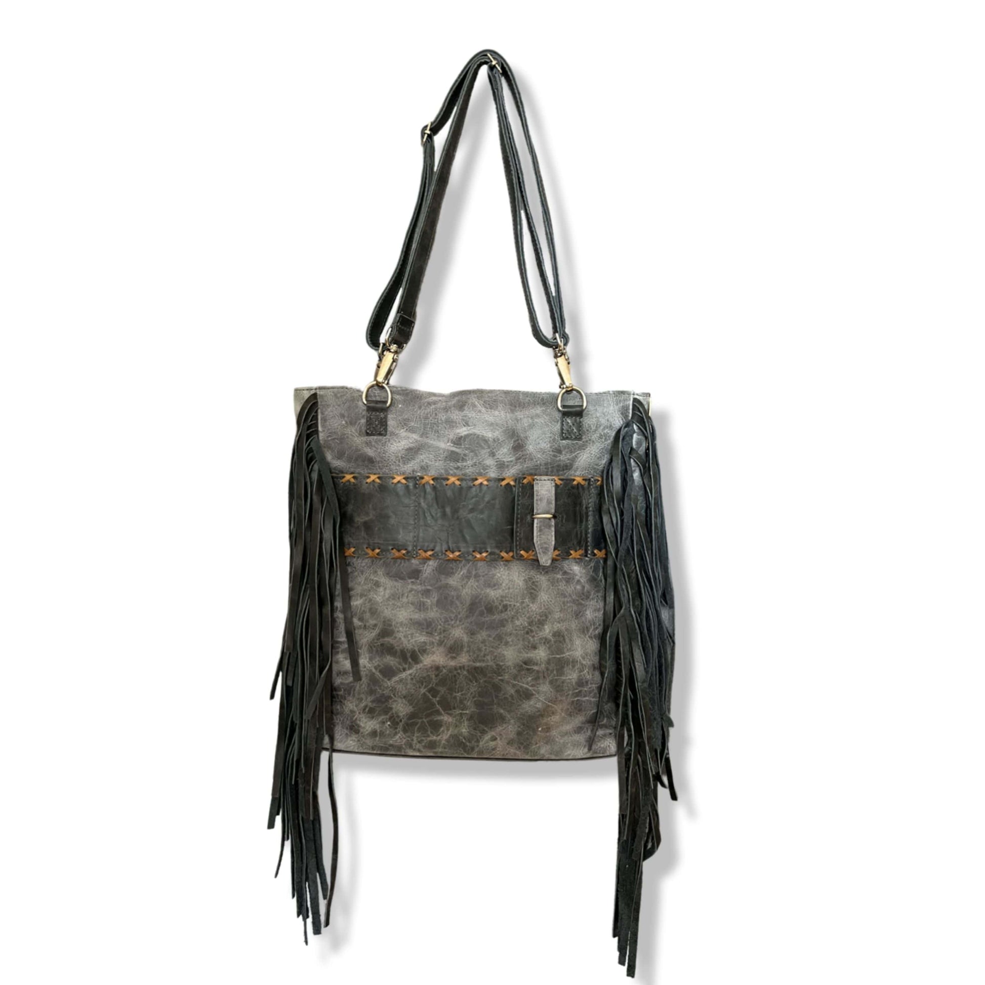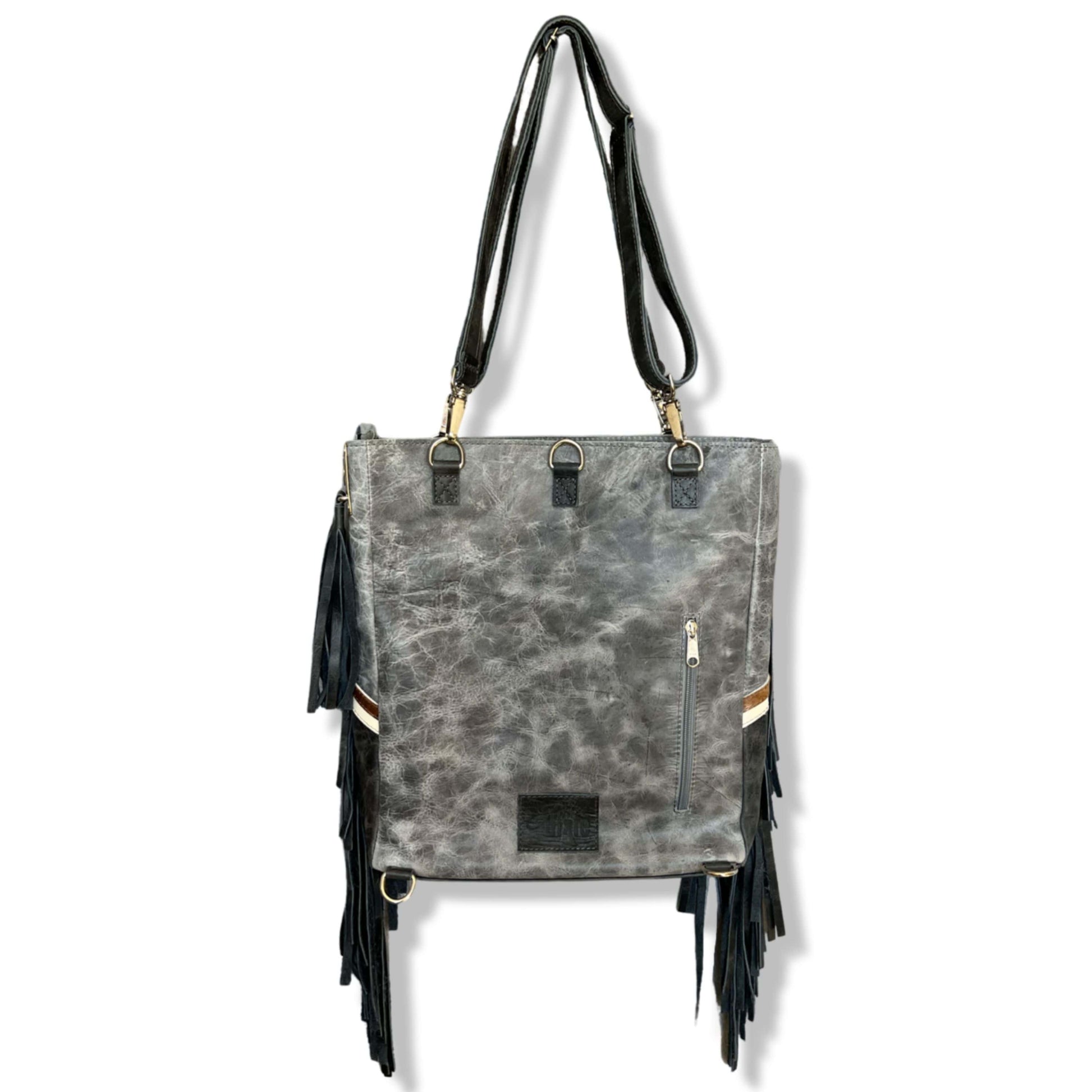 This 2-1 handbag can be worn as a handbag or a backpack. A twist on our newest size of handbag, the Lou now comes in a new color and fringe!! The combination of various grays creates the perfect bag for the ladies who love a simplistic look.