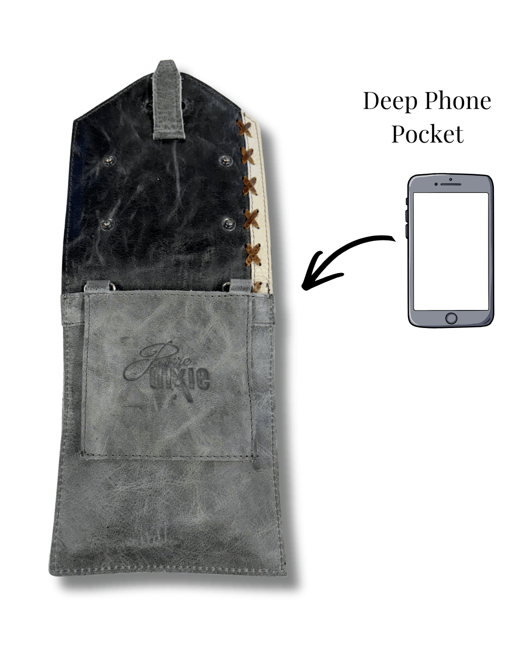 Similar to the concrete pouch this mini combines beautiful shades of gray, ivory, and tan. The unique design provides the perfect color combo that will go with everything! Wear it as a crossbody or attached to any one of our bigger handbags!