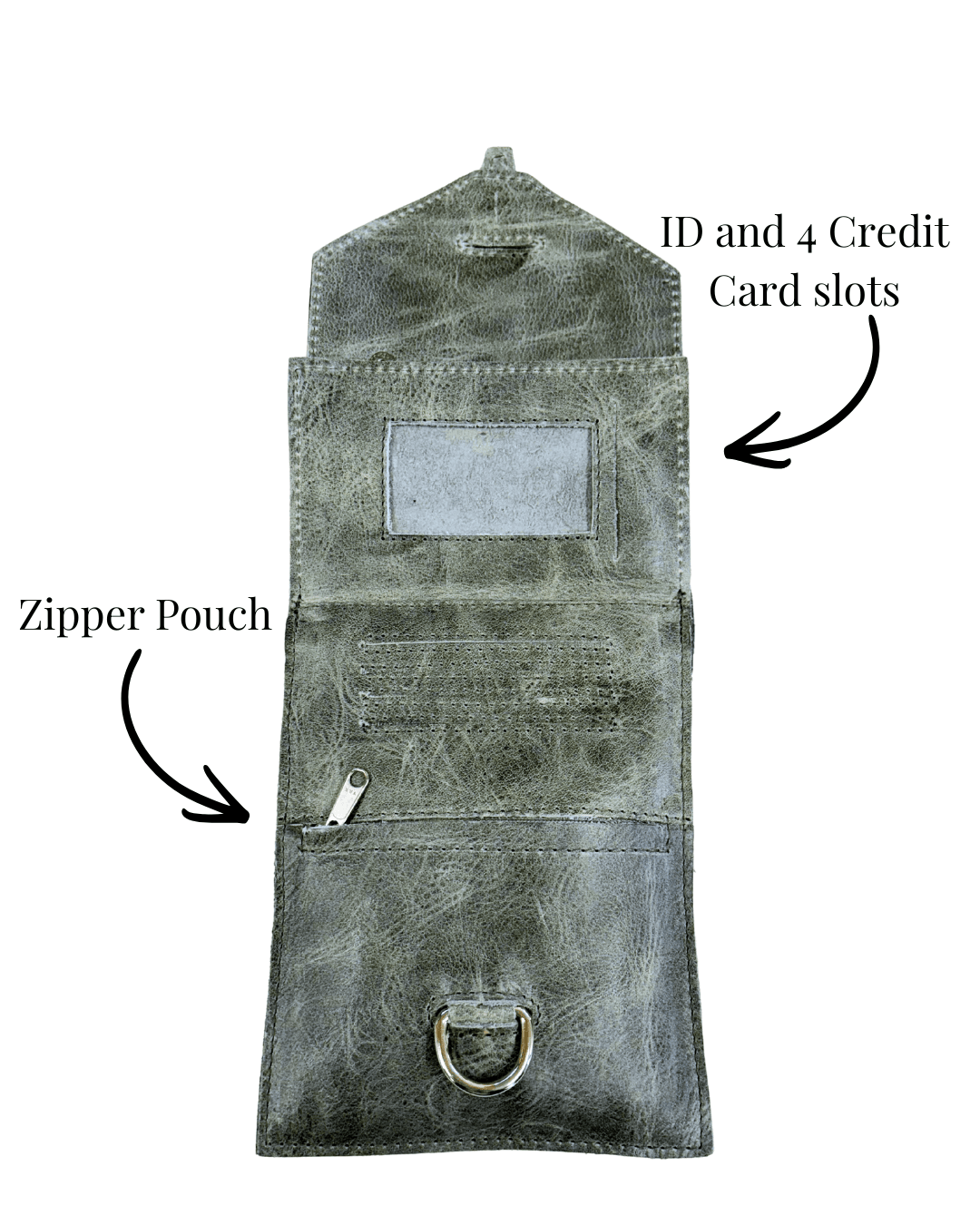 - Interior has place for ID, cards, cash, zipper pocket, and deep full length pocket