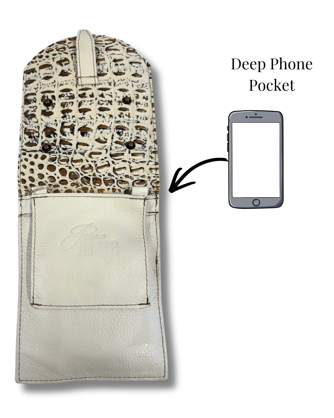 Part of The Urban Dundee Collection, the Sue Mini features gorgeous embossed croco cow hide leather with an ivory leather accent and beautiful tan contrast stitching.